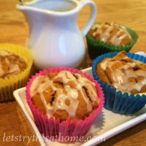 While you’re waiting for them to cool, make the glaze by combining the icing sugar, orange juice and maple syrup. You might find you need a bit more or a bit less icing sugar. When the muffins are completely cool, drizzle over the glaze.