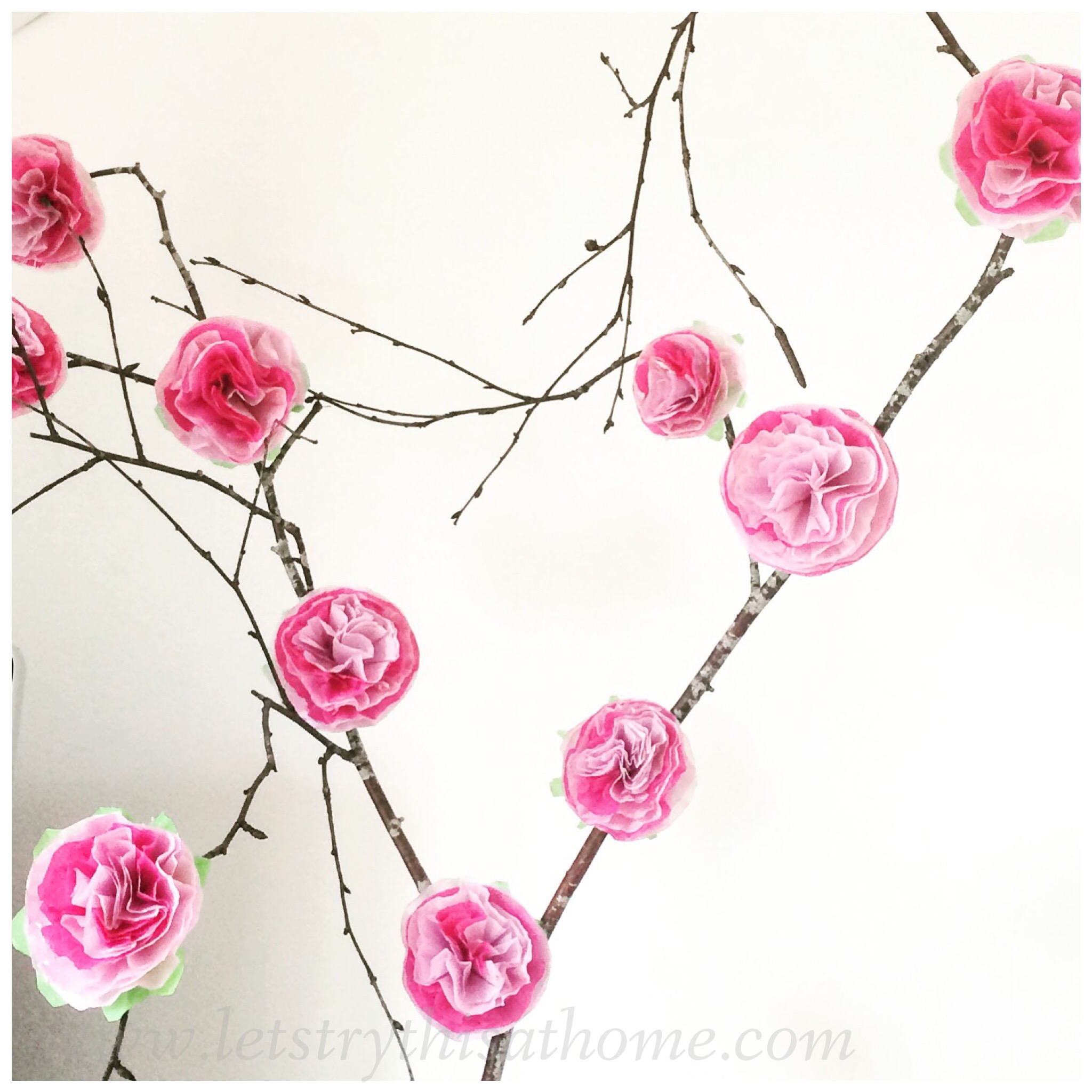 Summer means flowers, so what better way to re-start than with some rather fetching pink paper ones? These were so easy to make – all we needed were a couple of sheets of tissue paper in two shades of pink, a pair of scissors, a glass to draw round and some pipe-cleaners.