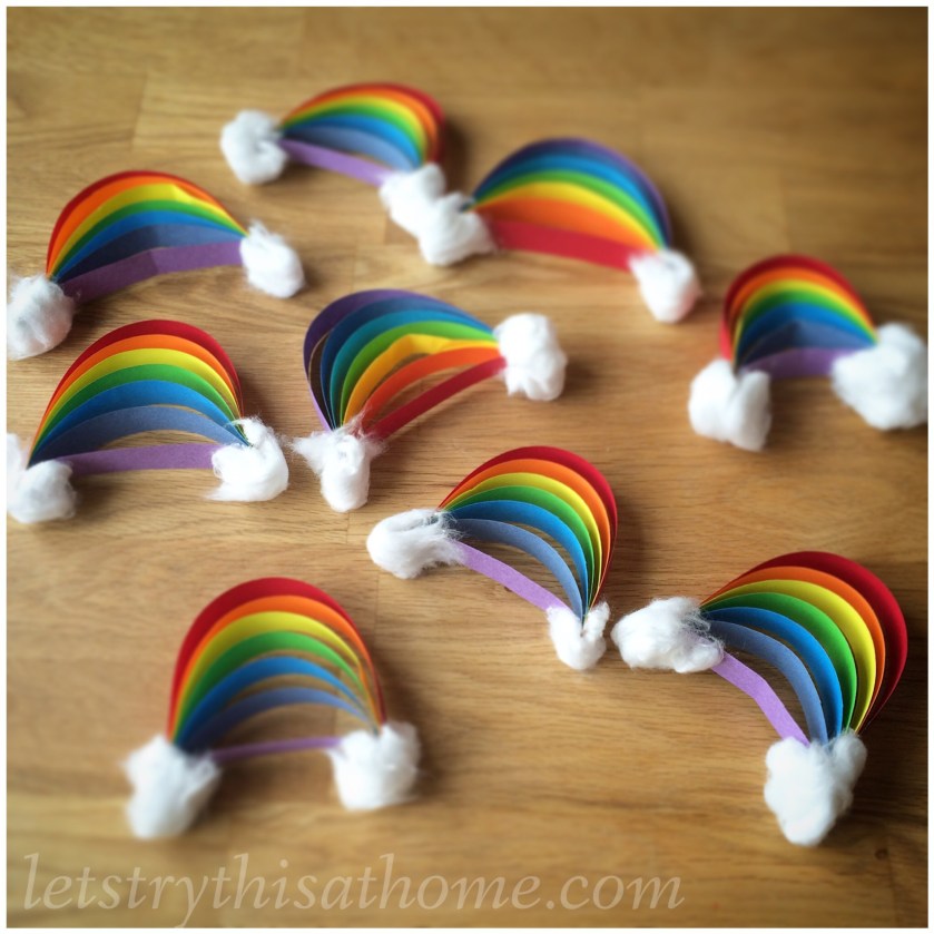 We’re a bit late to the party with our April season tree, since it’s now May. April usually means April showers, but we decided we needed something more cheerful (not to mention easier to make!), and settled on rainbows. The pictures pretty much speak for themselves, but a quick how-to follows the pictures anyway. If anyone has any bright ideas for our May decorations feel free to share! Take seven sheets of coloured paper and arrange them in rainbow order. Cut into strips of equal width (ours were about 2cm) Trim the strips so that each is around 2cm shorter than the next. Staple the ends. Cover the staples with cotton wool (or white paper) clouds. Hang as a garland, mobile or branch decoration.